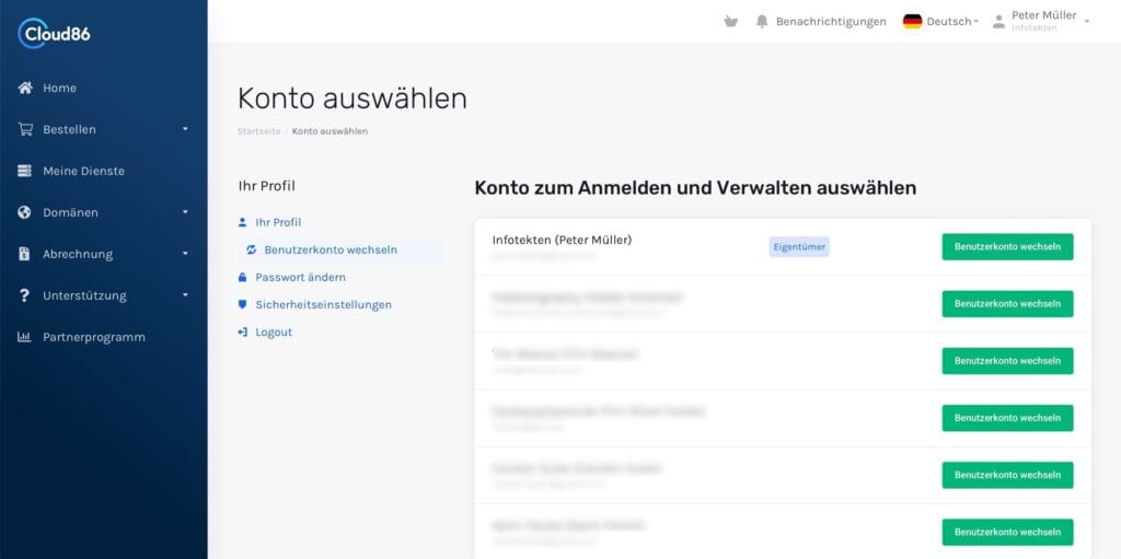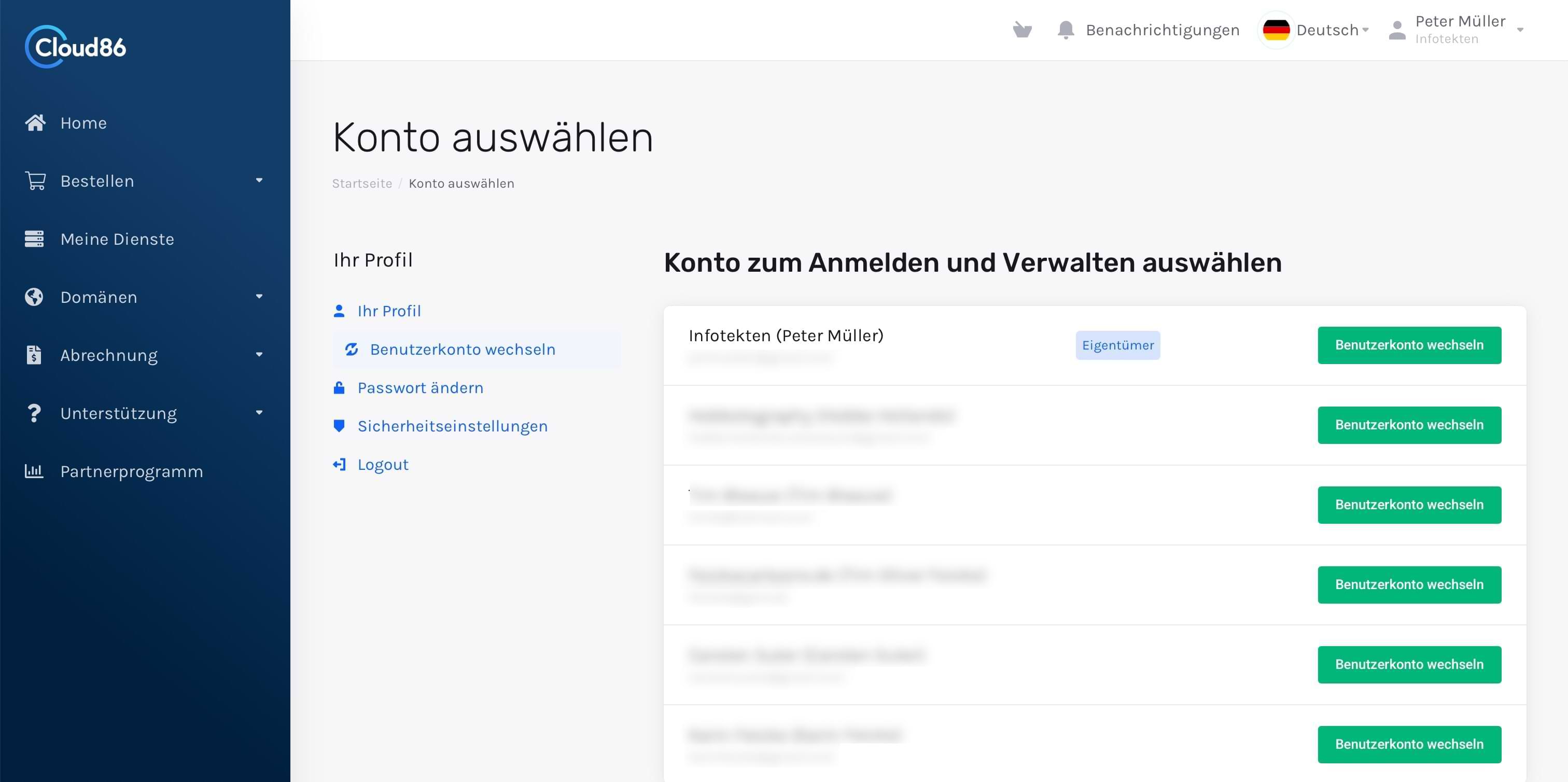 Nach dem Akzeptieren der Einladung erscheint das Konto dann in meinem MyCloud86-Account und ich kann mit einem Klick dorthin wechseln. Zum Verwalten von Projekten muss man nicht einmal ein eigenes Webhosting-Paket bei Cloud86 haben.