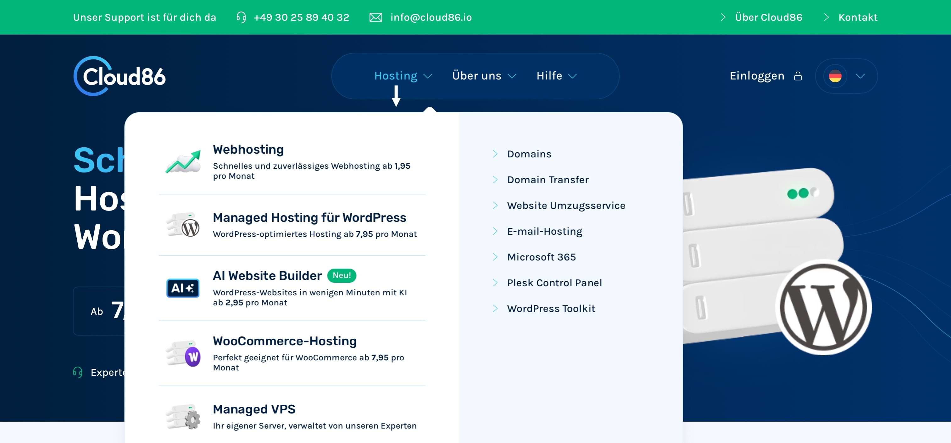 Falls Sie Hilfe bei der Auswahl eines Tarifs benötigen, können Sie +49 30 258 940 32 anrufen, eine Mail an info@cloud86.io schreiben oder online einen kurzen Test machen (den Sie auch unten im Footer finden).