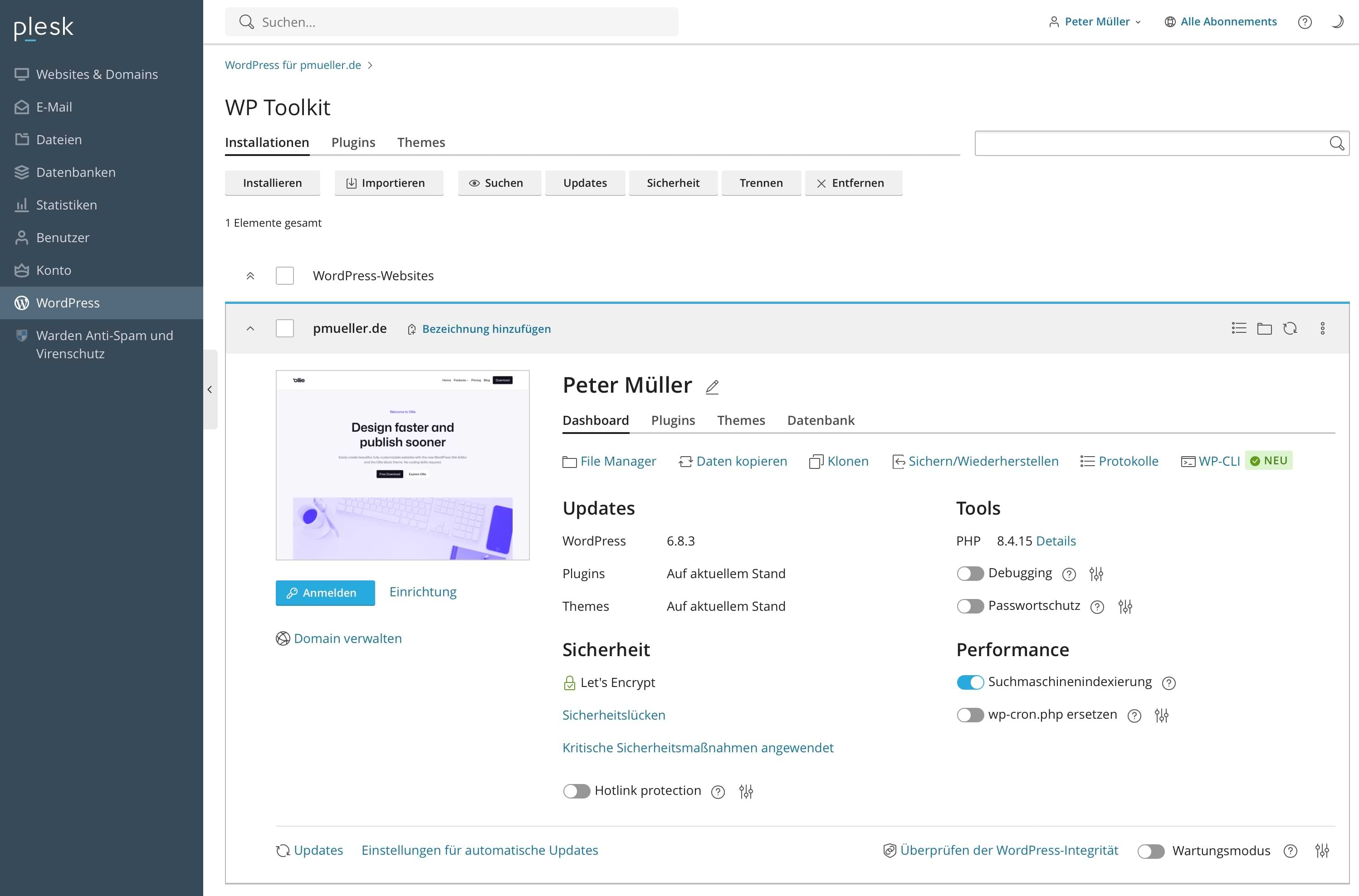Cloud86 setzt bei der Webspace-Verwaltung auf die Standardlösung Plesk, die ich recht übersichtlich finde. Darin enthalten ist z. B. der WordPress-Toolkit, der wichtige Funktionen direkt auf dem Webspace zur Verfügung stellt und so diverse Plugins spart: